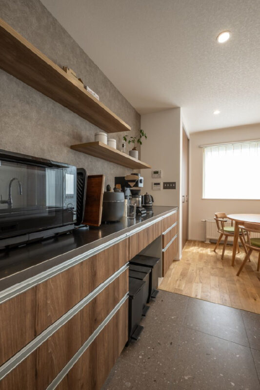 奥 様「私はやっぱりキッチンです。天板のステンレスは大正解でした。奥行のあるタイプにしたので物が多く置けて便利です。洗面カウンターの⾧さやユーティリティーの収納など、洗濯の家事動線がラクでお気に入りの場所となっています!」