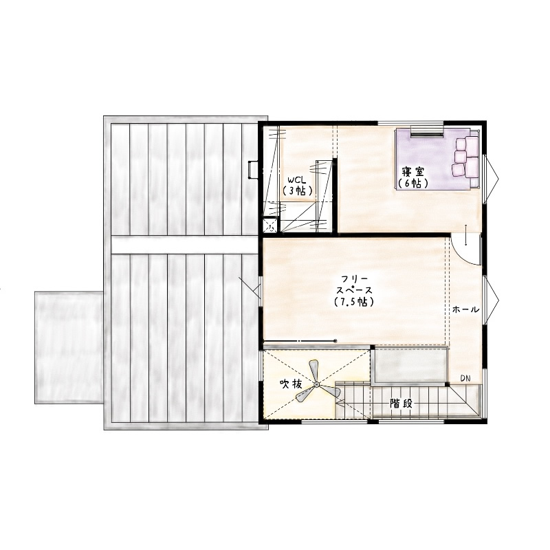 洗面化粧台はダストボックススペースを造ったりとこだわりを感じました。室内窓も玄関とリビングのポイントにもなっていてとても素敵です☆2階のフリースペースはどの様に活用されているんですか?