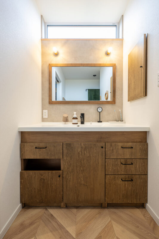 奥 様「私は造作の洗面化粧台と玄関の土間からリビングが見えるようにした室内窓です☆毎日使う洗面化粧台なので化粧品など使いやすく収納しやすいです。室内窓は、玄関に入った瞬間リビングや愛犬達の様子が見れますし、空間も広く見えてとても気に入っています♪」