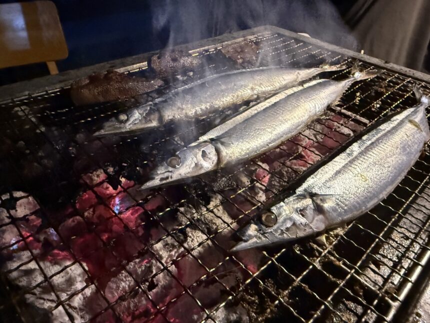 庭先で、今年初のサンマを炭火焼きしました。