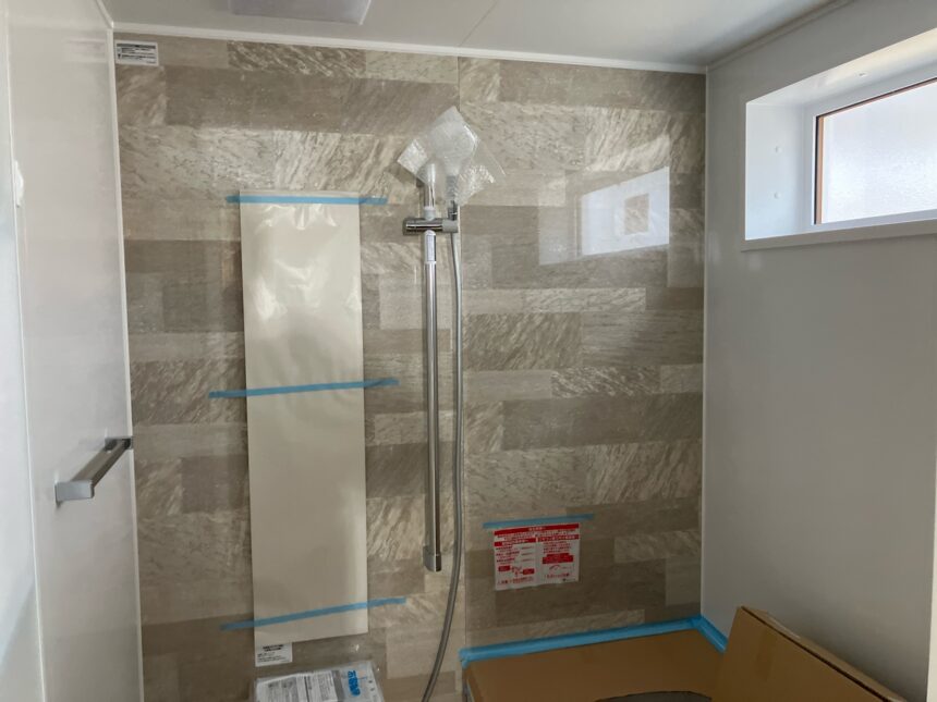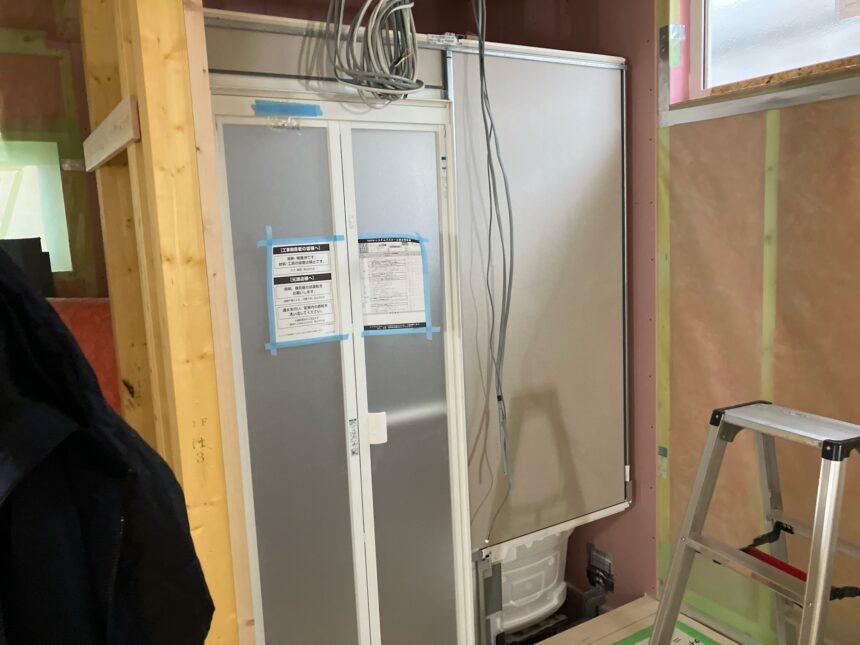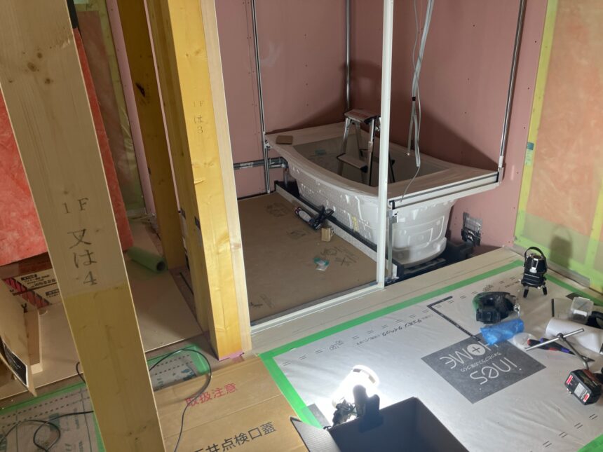 浴室が入りました。入社した当時、どうやって浴室をいれるのか疑問だったのですが、